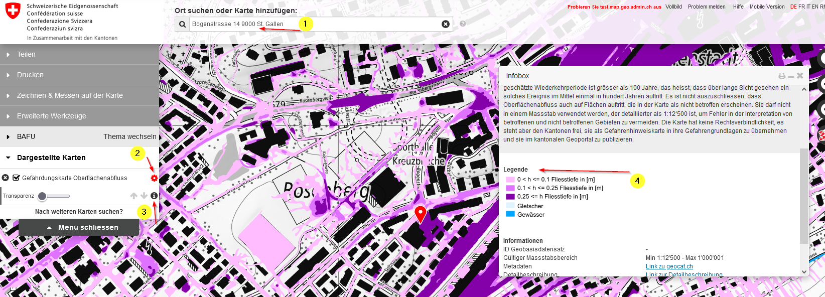 Auf der Homepage vom Bundesamt für Umwelt mittels Adresseingabe die Gefährdung prüfen